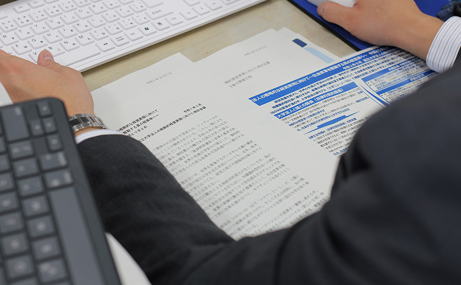日々の業務では、総務・財務・教務等を担当する事務職員だけではなく、役員や関係する教員とも緊密に連携し、大学としての方向性や戦略の検討を進め、企画委員会等における審議に向けた準備等を行っています。